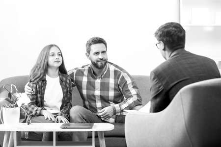 Father and child daughter with girl discussing problems in family with family psychologist. Discussion of family problems with psychologist. Parents telling the psychologist about child problems.