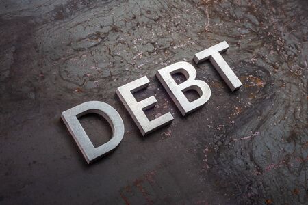 the word debt laid with silver letters on raw rusted steel sheet surface in slanted diagonal perspective with selective focus and background blur