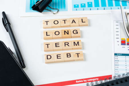 Total long term debt concept with letters on cubes. Still life of office workplace with supplies. Flat lay white surface with notepad, pen and financial report. Capital management and banking.