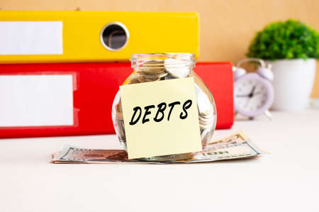 A glass jar with coins stands on a stack of dollar bills on the desktop. The jar has a sticker with the text DEBTS.