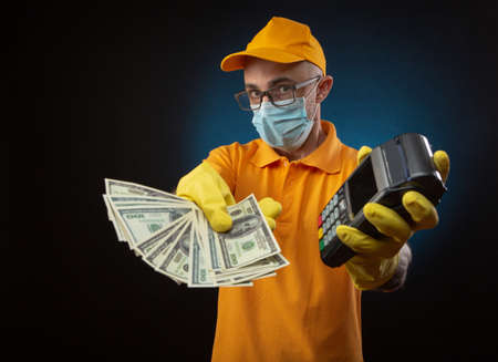 concept of security when paying for a product or service, businessman holding money and credit card in gloves. covid19 coronavirus