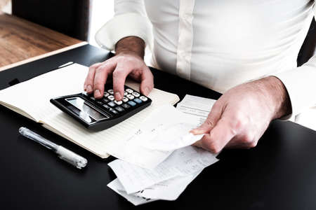 finance concept with man at desk with calculator, bills or sales slips and notpad