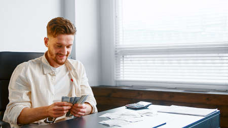 Smiling company manager with beard counts dollars in hands sitting at table near white window