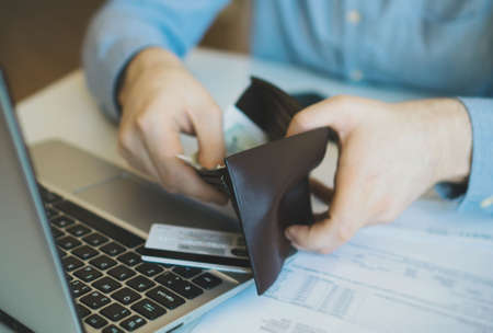 Taking care of personal finances. Invoices, bills, calculator and savings in cash to pay for taxes