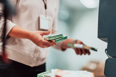 Bank employees holding a pile of paper banknotes while sorting and counting inside bank vault. Large amounts of money in the bank