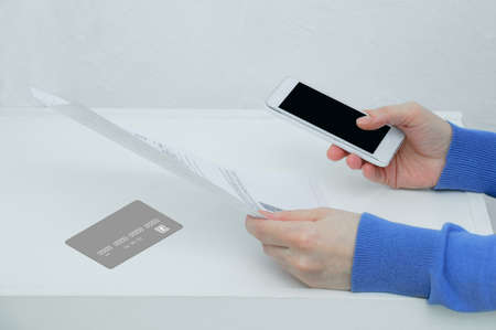 Smartphone in the hand of a caucasian woman and a paper document. concept loan agreement.