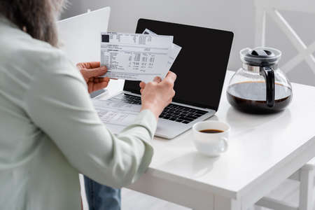 Cropped view of mature woman holding papers with bills near laptop with blank screen and coffee pot in kitchen