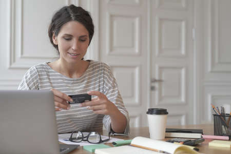 Portrait of cheerful smiling businesswoman sitting at desk at home office in front of laptop while looking at credit card, checking numbers and payment details for e-shopping, tax levy or deposit fee