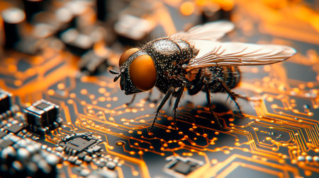 Close-up view of fly sitting on the computer motherboard, symbol of computer virus. AI generated