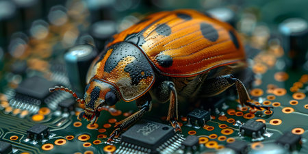 Computer Bug Closeup: Symbolizing the Threat of Software Vulnerabilities and Security Bugs. Concept Software Vulnerabilities, Security Bugs, Computer Threats, Bug Closeup, Technology Risks