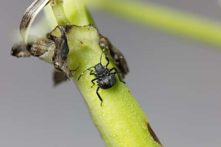 Nymphs of brown marmorated stink bugs, Halyomorpha halys, on a bean leaf.