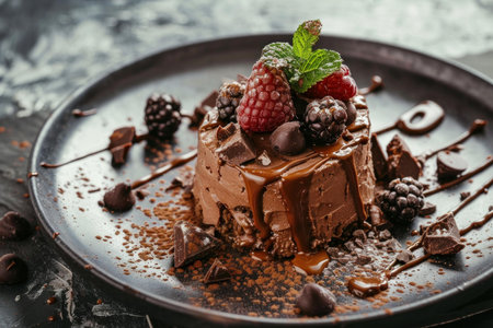 Elegant chocolate cheesecake adorned with fresh berries and caramel on a dark plate