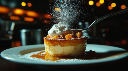 Haute cuisine dessert on restaurant table on dark backround. Generative AI.