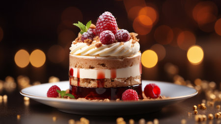 a layered dessert with raspberries and cream on a white plate with a blurred background of lights. It is a delicious and elegant dessert that is made with fresh fruit and pastry. High quality photo