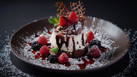Elegant chocolate desserts topped with berries and powdered sugar, served on a rustic wooden platter. Dark, moody lighting enhances the gourmet appeal.