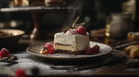 whipped cream with raspberries and mint, featuring a dark maroon and light brown color scheme. the photo showcases a multilayered texture with a soft and atmospheric lighting. the composition is reminiscent of the elaborate style of ken kelly and the les nabis movement, with a soft-focus effect. ai generated