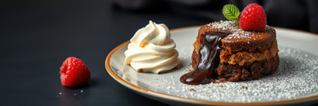 Decadent chocolate cake with melting center served with whipped cream and fresh raspberries
