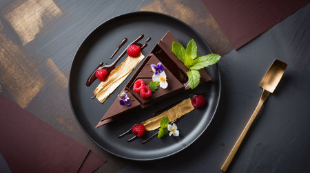 Luxury Chocolate Dessert with Gold Leaf, Fresh Raspberries and Mint on Black Hexagonal Plate, Modern Fine Dining Presentation with Red Berry Sauce