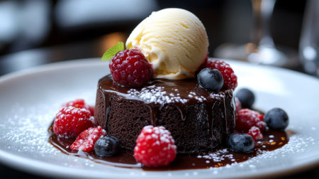 A mouth watering chocolate brownie in close up macro with vanilla ice cream and berries, dark chocolate sauce.