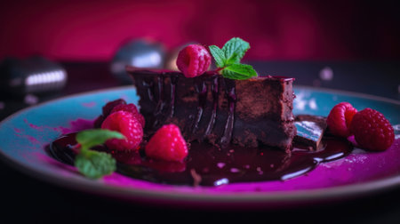 A luxurious chocolate dessert plated with a drizzle of raspberry sauce and garnished with mint leaves, showcasing a refined and indulgent culinary creation.