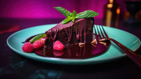 A piece of chocolate cake with raspberries on a plate. Generative AI image.
