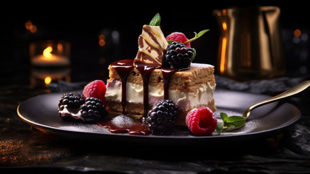 An AI generated illustration of a piece of delicious cheesecake with berries on the table