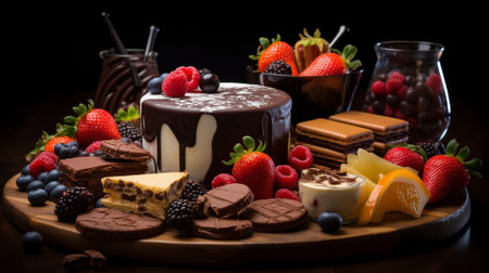 Delicious chocolate dessert table with fruits. dark chocolate day