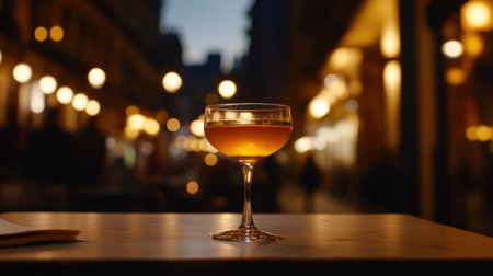 Illustration Glass of alcohol on a wooden table in a bar against a blurred background of people drinking.generative AI