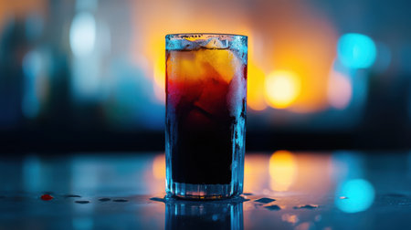 This stunning image showcases a colorful cocktail in a glass filled with ice, set on a bar counter. The blurred background creates a captivating ambiance, perfect for promotions or inspiration.