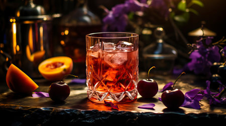 A glass filled with a drink sitting on top of a table. AI generative image.