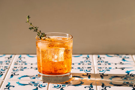 Close-up of a glass of soda and ice cubes with a sprig of thyme. Cool and delicious mineral water with fresh leaves. A sweet carbonated drink on a table with patterned tiles. Minimalism. Sunlight