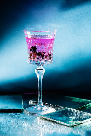 A lively composition featuring a vibrant cocktail with ice cubes, styled under bold and colorful lighting for a dynamic look.