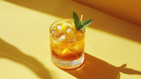 A well-crafted cocktail featuring ice cubes, mint leaves, and a slice of citrus, captured in bright light on a clean white background.