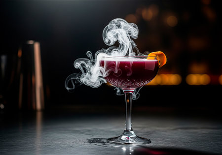 Craft cocktail with ice and smoke in a dark setting elevates the drinking experience during a special evening
