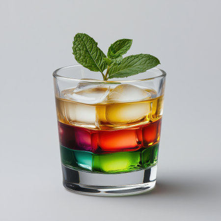 A transparent glass filled with colorful layered liquids and garnished with a mint leaf.