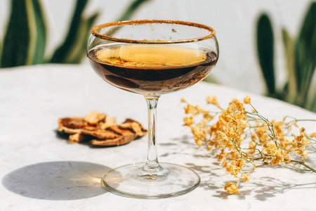 A classic sidecar cocktail in coupe glass, glowing in evening light