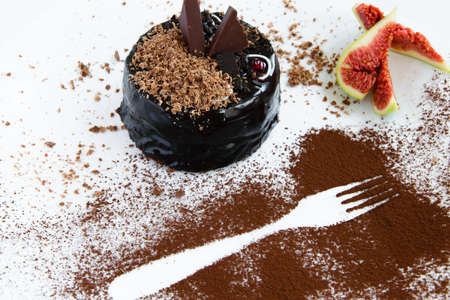 Close up view of delicious chocolate cake with figs in a plate and a fork outline cacao decoration