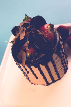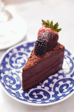 Slice of chocolate cheesecake topping with fresh strawberry and blackberry.