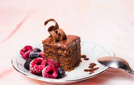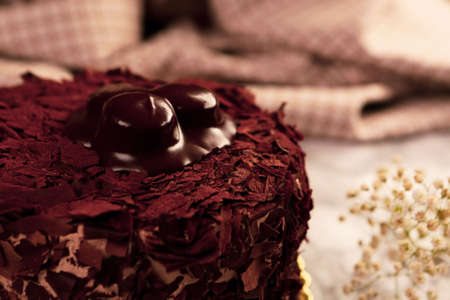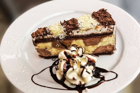 beautiful chocolate cake on the plate with choco decor in restaurant