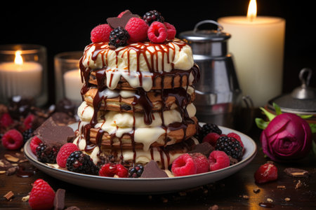 Chocolate dessert with raspberry and blackberry, cheesecake with fresh berries, nuts and caramel. Selective focus, AI generated
