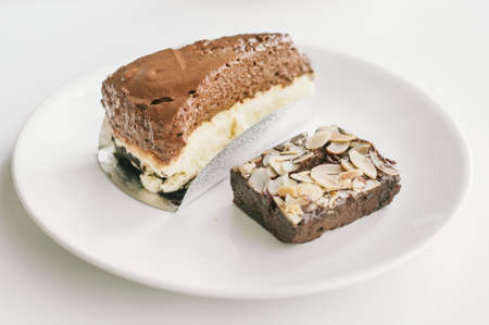 A piece of dark chocolate cake with two cream layers on a white background and chocolate powder