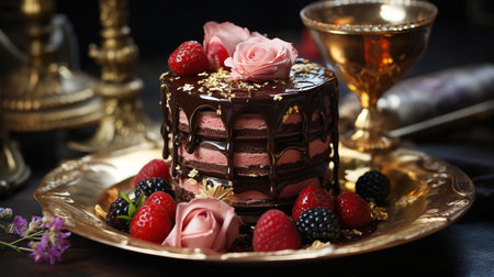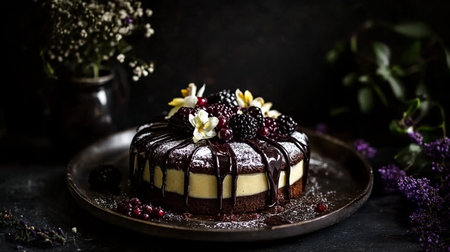 Smooth glossy dessert cake with chocolate, fresh berries, and soft flower decoration in moody low light.