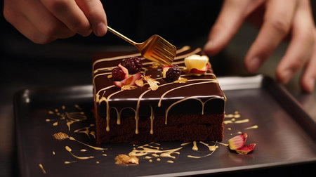 This exquisite close-up image showcases luxurious chocolate dessert squares embellished with gold leaf and fresh raspberries, perfect for fine dining and special occasions.