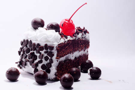 A piece of chocolate cake with cherries. Cake side view on a white background. copyspace.