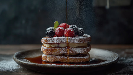 A stack of French toast slices dusted with powdered sugar and topped with fresh berries and a drizzle of maple syrup, served on a rustic ceramic plate.