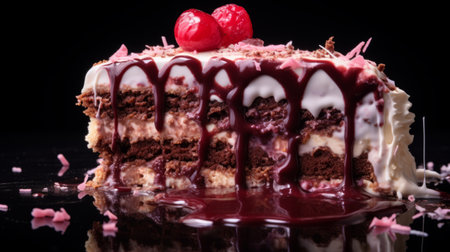 a slice of raspberry cake, with a layered and complex composition, is showcased in this image. processed with darktable, the colors of red and brown are rich and realistic. the still-life presentation exudes luxury and boldness, while the selective focus adds to the overall impact. this large-scale photograph captures the vibrant and colorful essence of the cake. ai generated