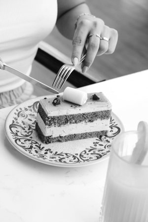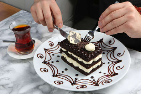 food, junk-food, culinary, baking and holidays concept - close up of male hands eating chocolate cherry cake with fork and sitting at wooden table.tasty dessert.chocolate cake slice on white plate.