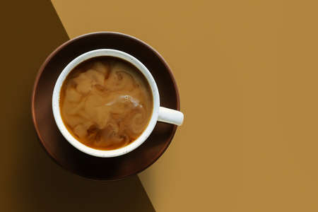 Coffee with swirl of milk or cream. Cup of morning drink, saucer on double diagonal background. Monochrome horizontal banner, poster with copy space. Chocolate brown, beige colors. Flat lay trend