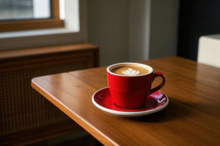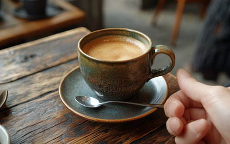A hand is reaching for a spoon next to a warm coffee cup resting on a saucer atop a rustic wooden table, creating a relaxing moment in a cozy cafe during the afternoon.