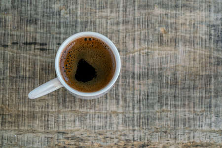 Behind every successful person is a substantial amount of coffee. Table top view of a white cup of fresh brewed espresso against dark background of slate.